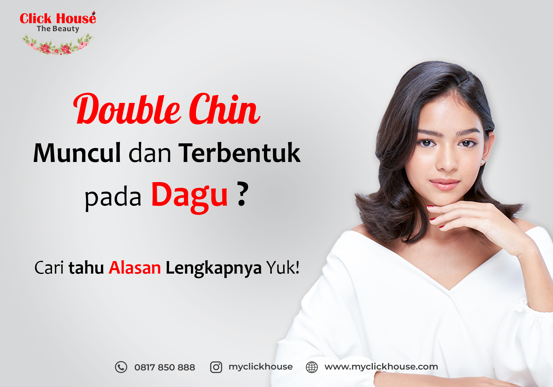 Agar dapat mengembalikan kepercayaan Clickmates, Click House memiliki solusinya untuk mengatasi double chin. Tanpa basa basi treatment seperti Instant Face Tightening, HIFU Face Tightening Advance, Threadlift, Filler Chin hingga Instant Dramatic V-Shape dapat Clickmates coba untuk menghilangkan double chin. Adakah salah satu treatment yang pernah Clickmates coba?