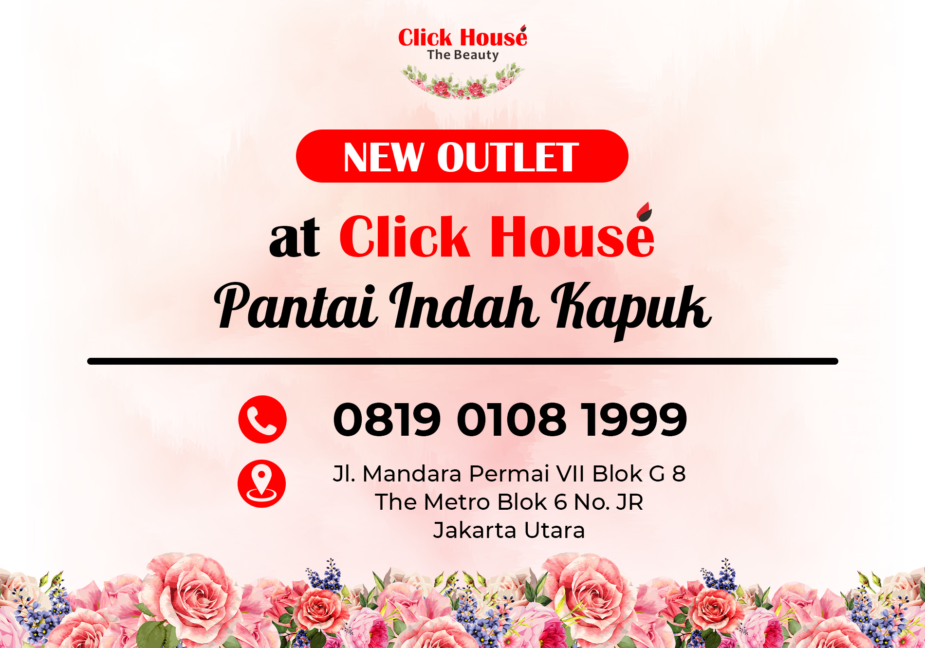 Sebagai bentuk inovasi dalam melayani Clickmates secara maksimal, dengan senang hati kami informasikan bahwa kini Click House hadir di Pantai Indah Kapuk, tepatnya di Jl. Mandara Permai VII Blok G 8 - The Metro Blok 6 Nomor JR Jakarta Utara.