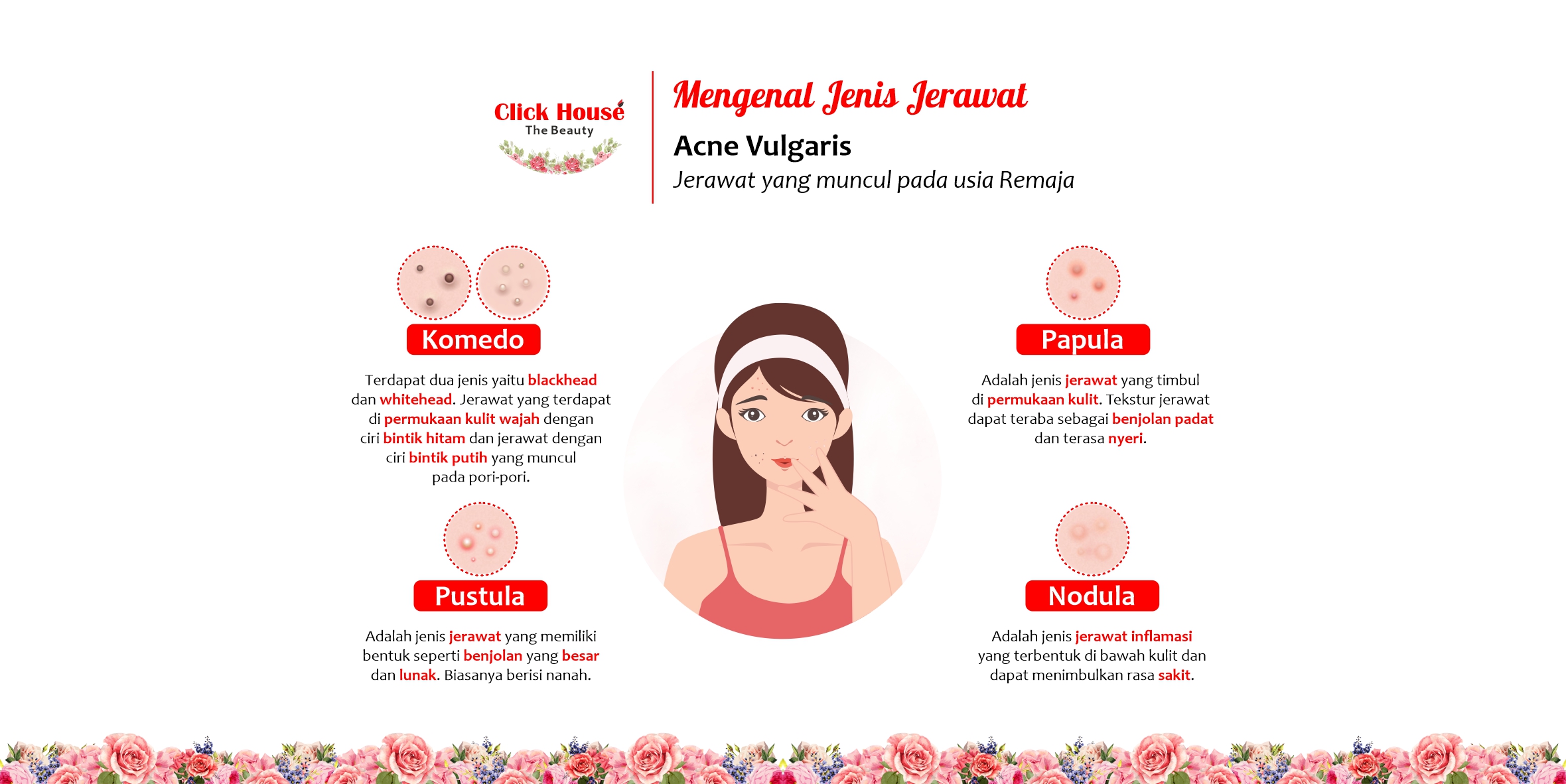 Walaupun jerawat bukan kondisi yang serius, tetapi jika tidak dapat diatasi dengan baik akan menyebabkan bekas luka. Perubahan hormon, seperti yang terjadi selama masa remaja dan biasanya sangat berperan sehingga memunculkan jerawat dan dapat menimbulkan bekasnya. Kenali jenis jerawatnya yuk agar kita dapat lebih waspada dan dapat ditangani dengan benar.
