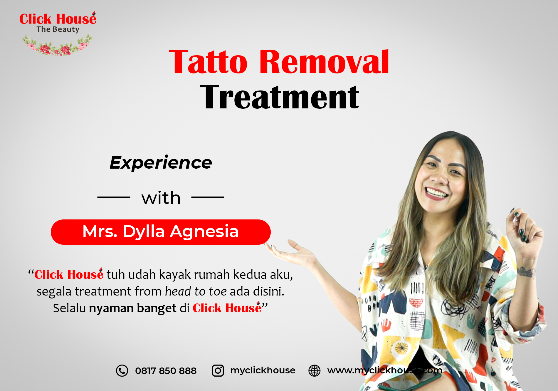 “Clickmates harus tahu kalau Picolaser Tatto Removal ini bisa menghilangkan tatto kita, tapi tidak dalam satu kali treatment, jadi memang harus step by step. Dari yang pertama, kedua, dan ketiga itu hasilnya keliatan banget. Lama-lama tatto akan hilang, dan semakin seperti warna kulit kita sebelum di tatto” ucap Mrs. Dylla Agnesia mengenai proses dalam melakukan treatment ini.