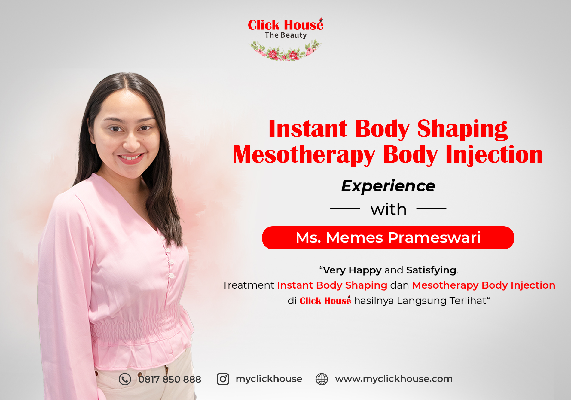 “Buat Clickmates yang ingin treatment seperti aku di Click House, kalian bisa kepoin Instagramnya di @myclickhouse dan juga bisa mengunjungi Websitenya di www.myclickhouse.com. Treatment Instant Body Shaping dan Mesotherapy Body Injection di Click House hasilnya langsung terlihat. Aku sudah ke Click House, kalau Kamu ?” ucap Ms. Memes Prameswari