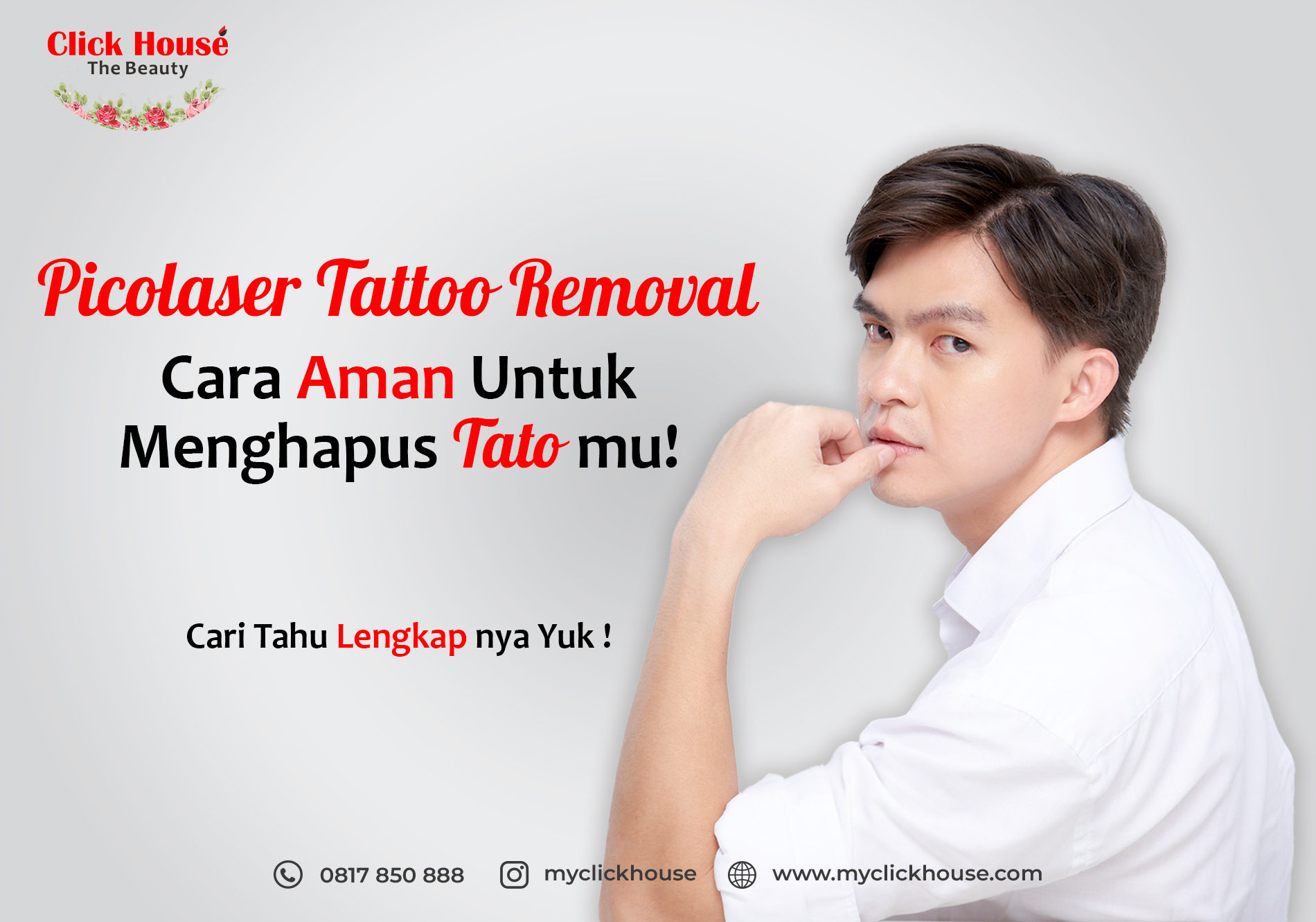Untuk lagkah aman, Clickmates dapat menghapus tato di Click House dengan melakukan perawatan Picolaser Tattoo Removal yang dapat menghapus tato secara permanen. Ini merupakan perawatan untuk menghilangkan tato dengan mengunakan tekologi laser paling canggih dan terbaru yang mampu menghilangkan tato lebih cepat dan lebih aman hingga tidak memiliki downtime karena pemulihan setelah di treatment juga lebih cepat dan lebih maksimal.