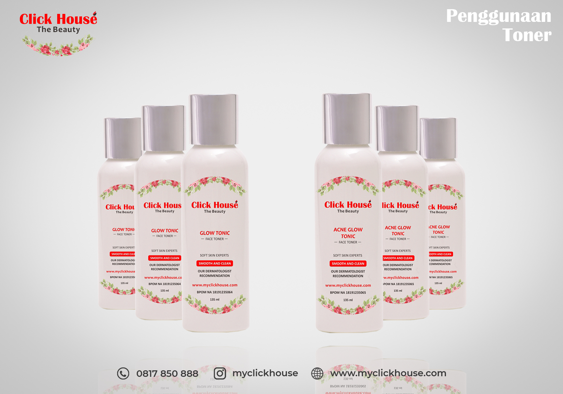 Clickmates bisa menggunakan Glow Tonic Facial Toner dan Acne Glow Tonic Facial Toner dari Click House karena Toner ini mampu membersihkan dan menyegarkan wajah hingga dapat mengecilkan pori-pori, mengurangi produksi minyak berlebih, mencegah komedo, jerawat, bruntus dan mengangkat sel kulit mati sehingga membuat wajah lebih cerah, segar dan bersih.