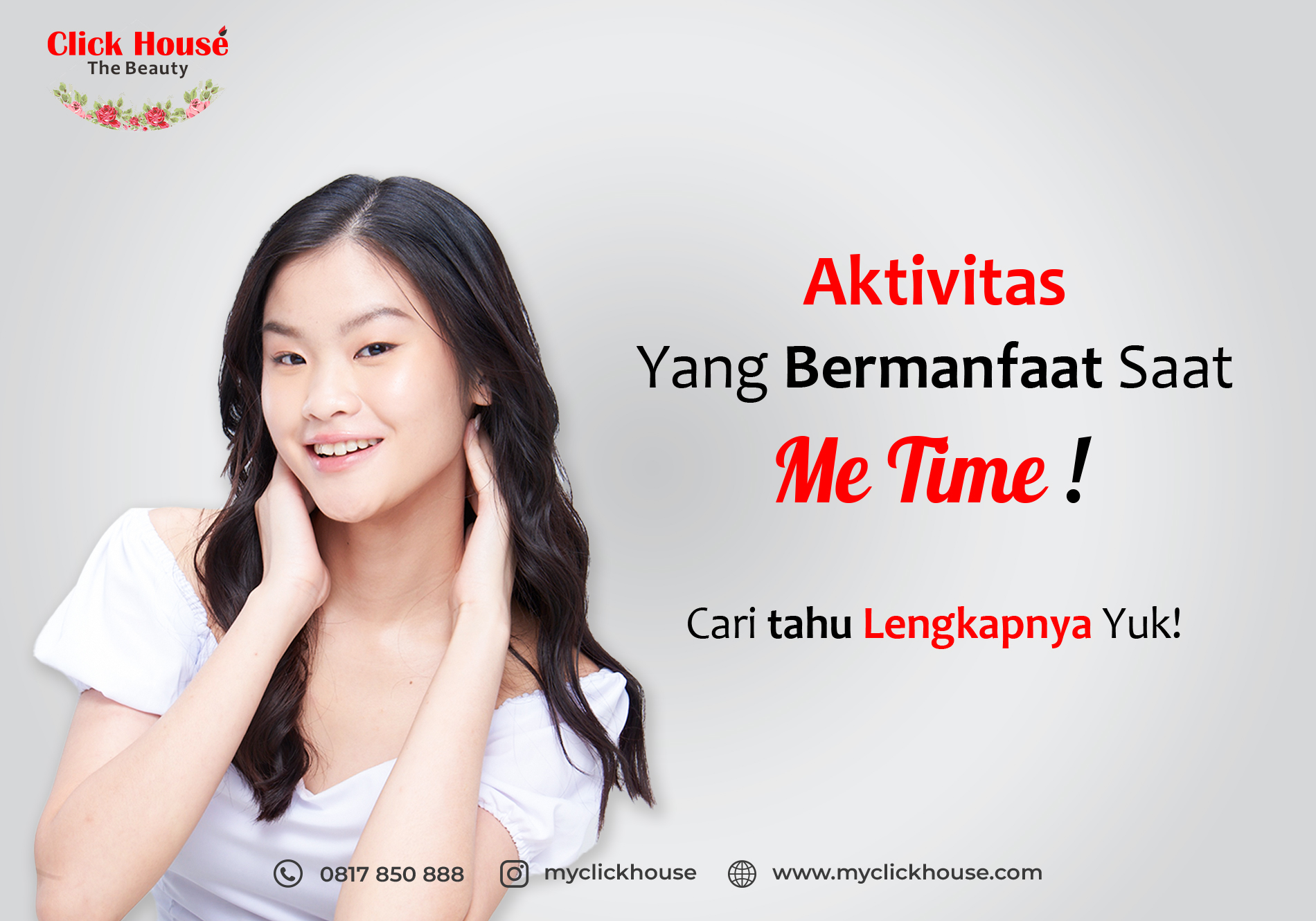 Ide me time dengan melakukan treatment di Click House adalah hal seru lainnya yang dapat Clickmates coba. Treatment dapat menjadi momen Clickmates untuk relaksasi yang menenangkan dan mendapatkan kulit yang cantik dan sehat secara maksimal. Jika Clickmates ingin me time dirumah namun tetap ingin melakukan perawatan, tidak usah khawatir. Click House dapat mengunjungi rumah Clickmates denga Click House Home Service? Tertarik mencobanya? Segera reservasi yuk!