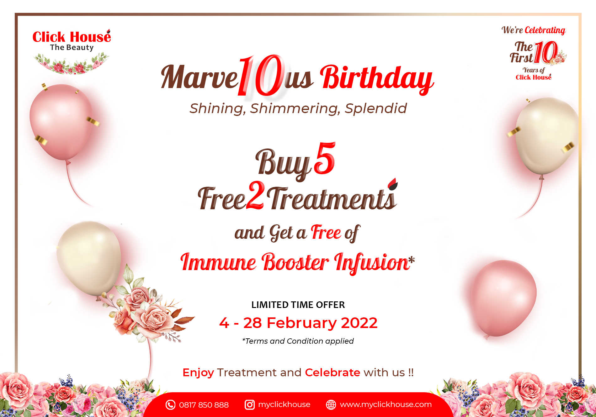 Nantikan kado special lainnya di hari ulang tahun Click House yang ke 10. Stay tuned, Clickmates! Enjoy treatment and Celebrate with us & let’s keep Shining Shimmering, Splendid!